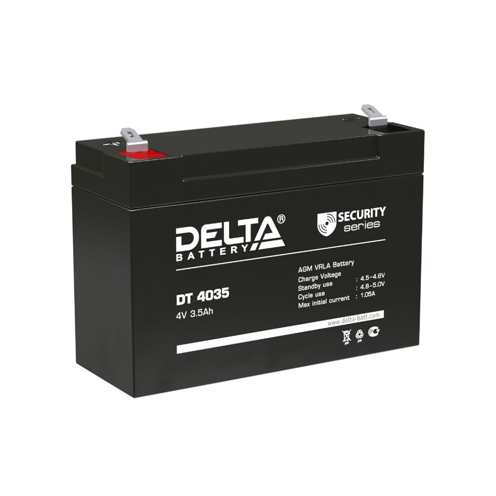 Герметичный необслуживаемый (не требует долива воды) свинцово-кислотный аккумулятор Delta DT 4035 для слаботочных систем оптимизирован к работе в буферном режиме. Выполнен по технологии AGM (Absorbent Glass Mat — электролит, абсорбированный в стекловолоконном сепараторе). Корпус аккумулятора изготовлен из негорючего материала. Легированные кальцием пластины обеспечивают низкий саморазряд, высокую конструктивную плотность решетки.