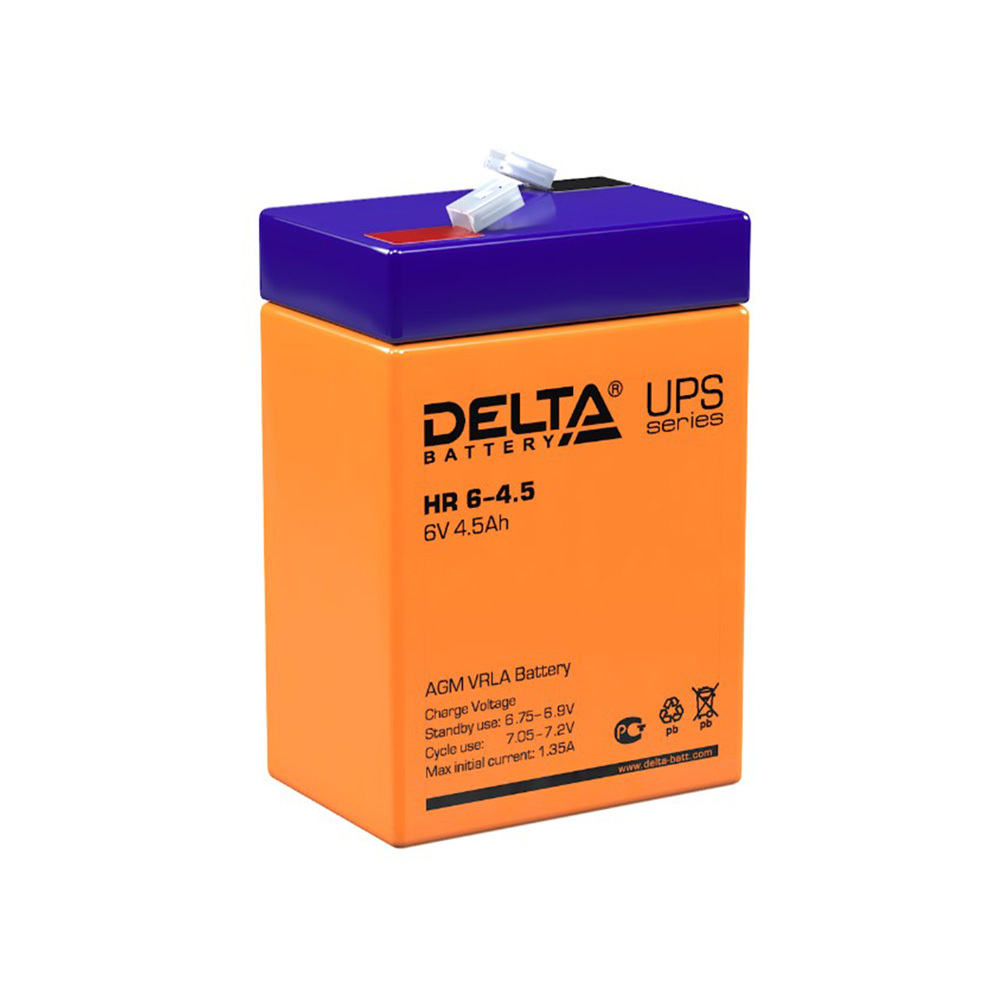 Герметичный необслуживаемый (не требует долива воды) свинцово-кислотный аккумулятор Delta HR 6-4.5 отличается высокой энергоотдачей, выполнен по технологии AGM (рекомбинация до 99 % выделяемого газа, предохранительный клапан сброса невозвращенных в электролит газов). Корпус аккумулятора выполнен из пластика ABS, не поддерживающего горение. Легированные кальцием пластины обеспечивают низкий саморазряд, высокую конструктивную плотность решетки.
