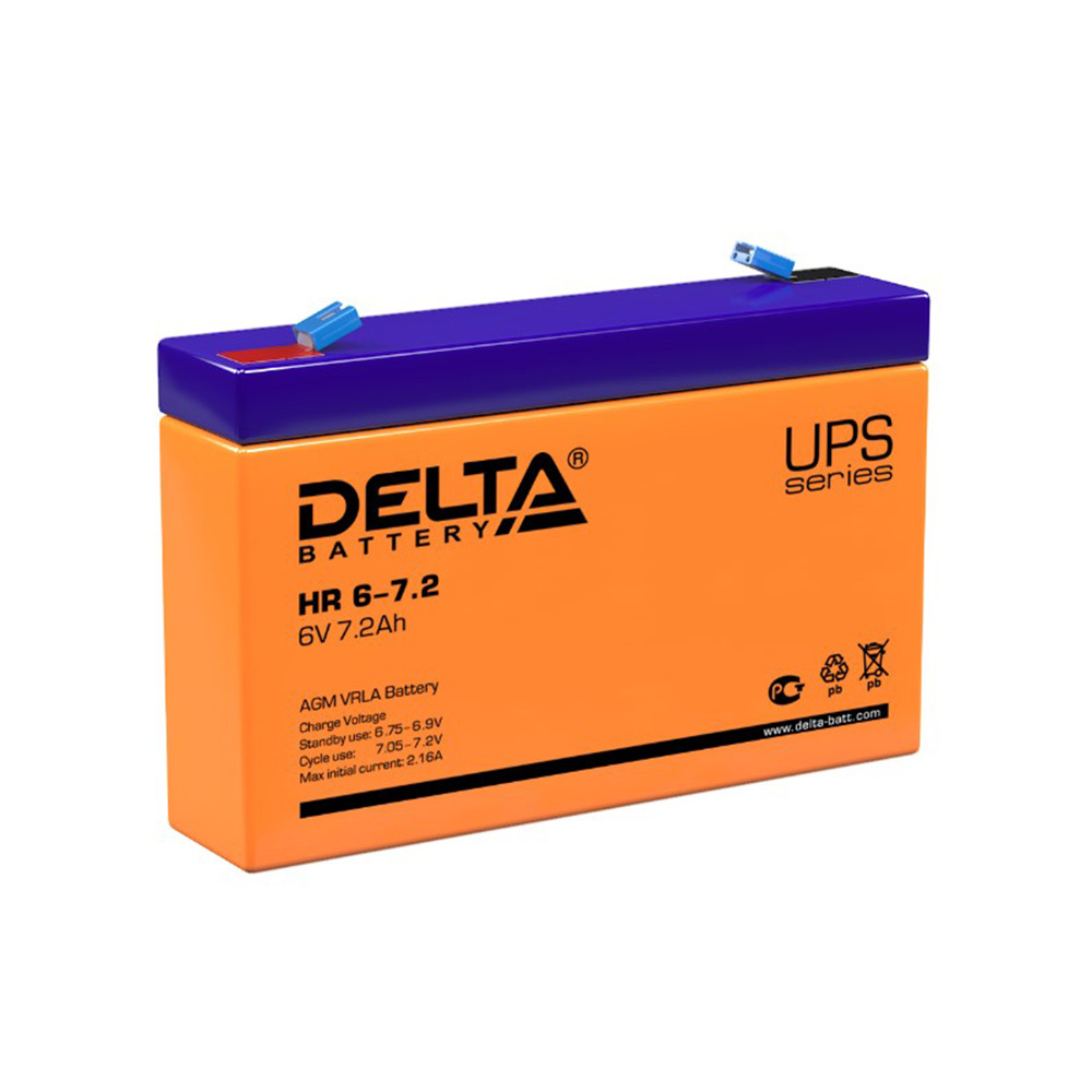 Герметичный необслуживаемый (не требует долива воды) свинцово-кислотный аккумулятор Delta HR 6-7.2 отличается высокой энергоотдачей, выполнен по технологии AGM (рекомбинация до 99 % выделяемого газа, предохранительный клапан сброса невозвращенных в электролит газов). Корпус аккумулятора выполнен из пластика ABS, не поддерживающего горение. Легированные кальцием пластины обеспечивают низкий саморазряд, высокую конструктивную плотность решетки.