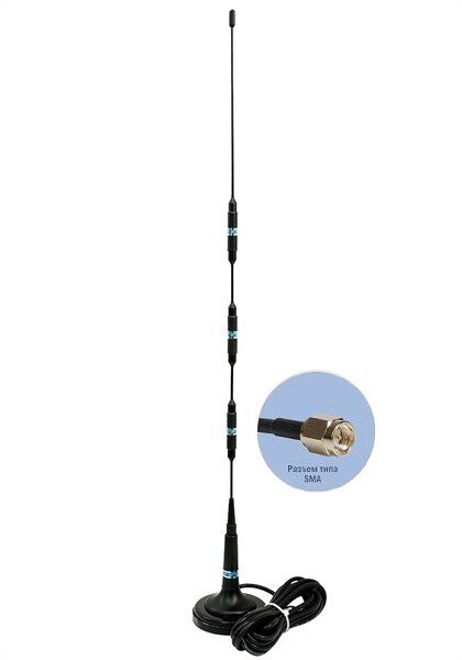 GSM антенна для промышленного GSM модема, пульта центрального наблюдения, стационарного GSM модема или сотового телефона, три катушки, SMA разъем, длина кабеля 5 м, коэфф.усиления 9 dB, магнитная база D72мм, высота антенны 620мм, ветровая нагрузка 200км/ч