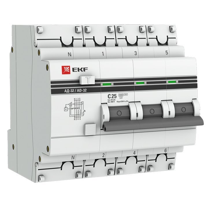 Дифференциальный автоматический выключатель АД-32 EKF PROxima представляет собой аппарат, сочетающий функции автоматического выключателя с устройством защитного отключения. При обнаружении автоматическим выключателем в защищаемом участке сети тока утечки (повреждения) на землю или сверхтока (тока перегрузки или короткого замыкания) происходит срабатывание устройства, приводящее к отключению защищаемой сети.