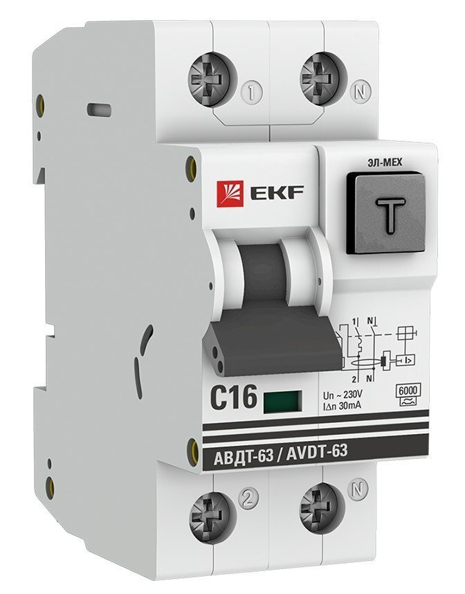Автоматический выключатель дифференциального тока АВДТ-63 EKF PROxima представляет аппарат, сочетающий функции автоматического выключателя с электромеханическим или электронным УЗО. При обнаружении автоматическим выключателем в защищаемом участке сети тока утечки (повреждения) на землю или сверхтока (тока перегрузки или короткого замыкания) происходит срабатывание устройства, приводящее к отключению защищаемой сети. Возможна коммутация алюминиевым и медным проводником.