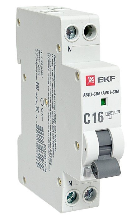 Автоматический выключатель дифференциального тока малогабаритный АВДТ-63М EKF PROxima представляет аппарат, сочетающий функции автоматического выключателя с электронным УЗО типа АС в компактном корпусе шириной один модуль. При обнаружении автоматическим выключателем на защищаемом участке сети тока утечки (повреждения) на землю или сверхтока (тока перегрузки или короткого замыкания) происходит срабатывание устройства, приводящее к отключению защищаемой сети. Особое отличие дифференциальных автоматических выключателей EKF с электронным УЗО – в наличии блока защиты от перенапряжения. Возможна коммутация алюминиевым и медным проводом.