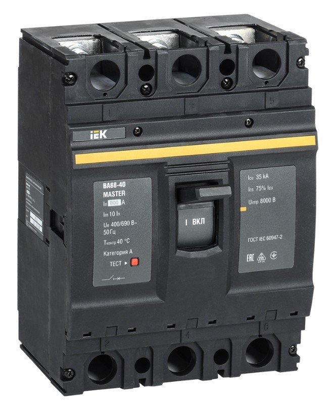 Автоматический выключатель в литом корпусе ВА88 MASTER предназначен для защиты электрических сетей от токов короткого замыкания, токов перегрузки, недопустимых снижений напряжения, а также для проведения тока в нормальном режиме. Автоматические выключатели производятся в 5 типоразмерах, оснащены термомагнитным расцепителем на токи от 16 до 800А и электронным расцепителем на токи от 125 до 800А. Рабочее напряжение 400/690 В. Конструкция автоматического выключателя предусматривает возможность самостоятельной установки дополнительных устройств на объекте заказчика.