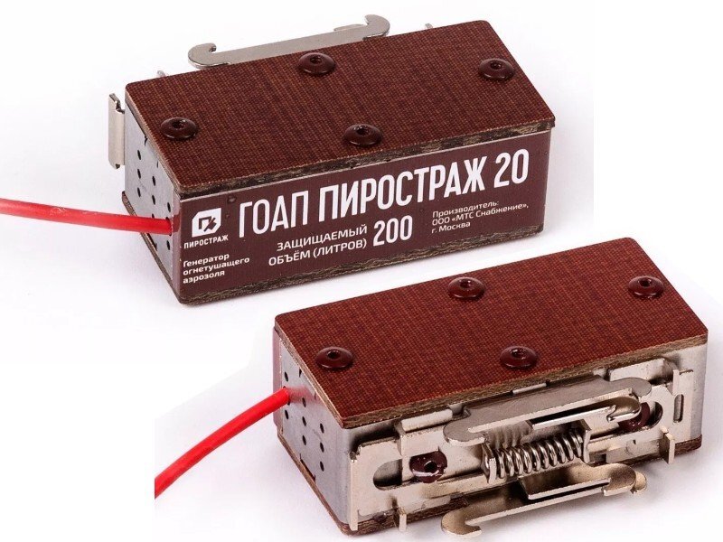 Огнетушитель Пиростраж 20 состоит из металлического корпуса в виде параллелепипеда с текстолитовыми накладками с двух боковых сторон, с наклейкой вокруг корпуса (ВНИМАНИЕ – наклейку не снимать!). В горизонтальной части огнетушителя имеются отверстия для выхода аэрозоля после сработки. Внутри корпуса размещается заряд аэрозолеобразующего состава (АОС).