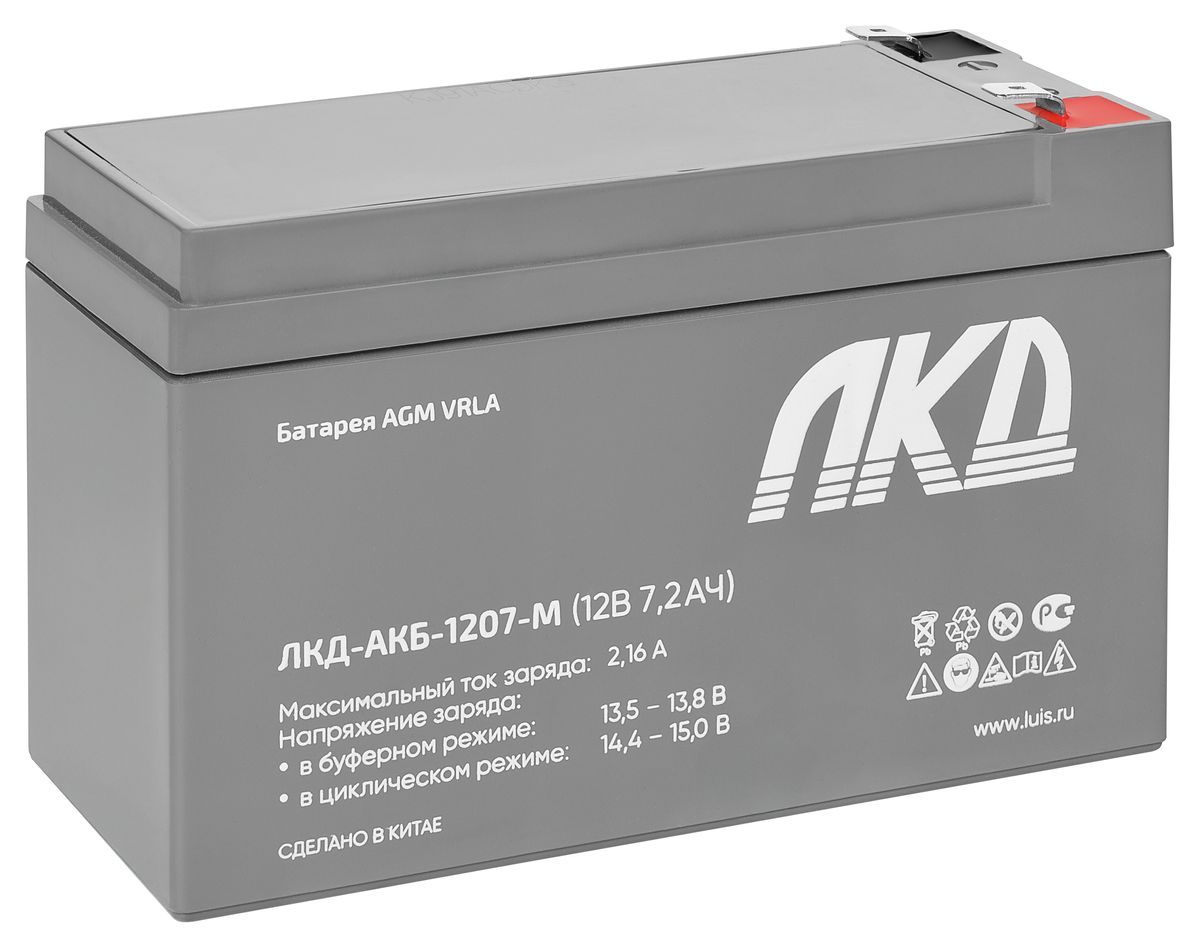 Аккумулятор герметичный свинцово-кислотный необслуживаемый 12В, 7.2 Ач. Предназначен для использования в составе источников бесперебойного питания, источников резервного питания, систем контроля доступа, систем тревожного оповещения и др. Производится по технологии AGM (Absorbent Glass Mat — электролит, абсорбированный в стекловолоконном сепараторе). Герметизация батарей проводится посредством использования клапана, обеспечивающего сброс избыточного давления газов в аккумуляторе (VRLA).