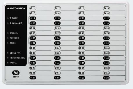 - отображает состояние приборов адресной подсистемы с расшифровкой тревог с помощью дополнительных светодиодов