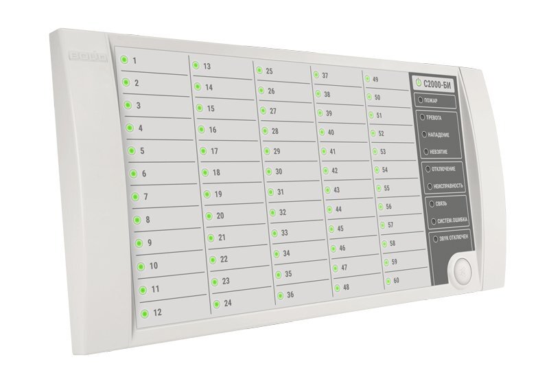 "С2000-БИ" предназначен для работы в составе ИСО "Орион" совместно с пультом контроля и управления "С2000" ("С2000М") и отображения с помощью встроенных индикаторов и звуковой сигнализации сообщений о событиях в 60 разделах системы.