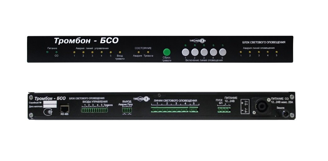 Блок управления световыми оповещателями «Тромбон БСО» предназначен для управления световыми оповещателями в системах оповещения и управления эвакуацией (далее СОУЭ) 1, 2, 3, 4 и 5-го типов. Блок обеспечивает управление световыми оповещателями при пожаре и других чрезвычайных ситуациях. Блок принимает командные сигналы от прибора управления пожарного, установки пожарной сигнализации и удалённых выключателей светового оповещения.