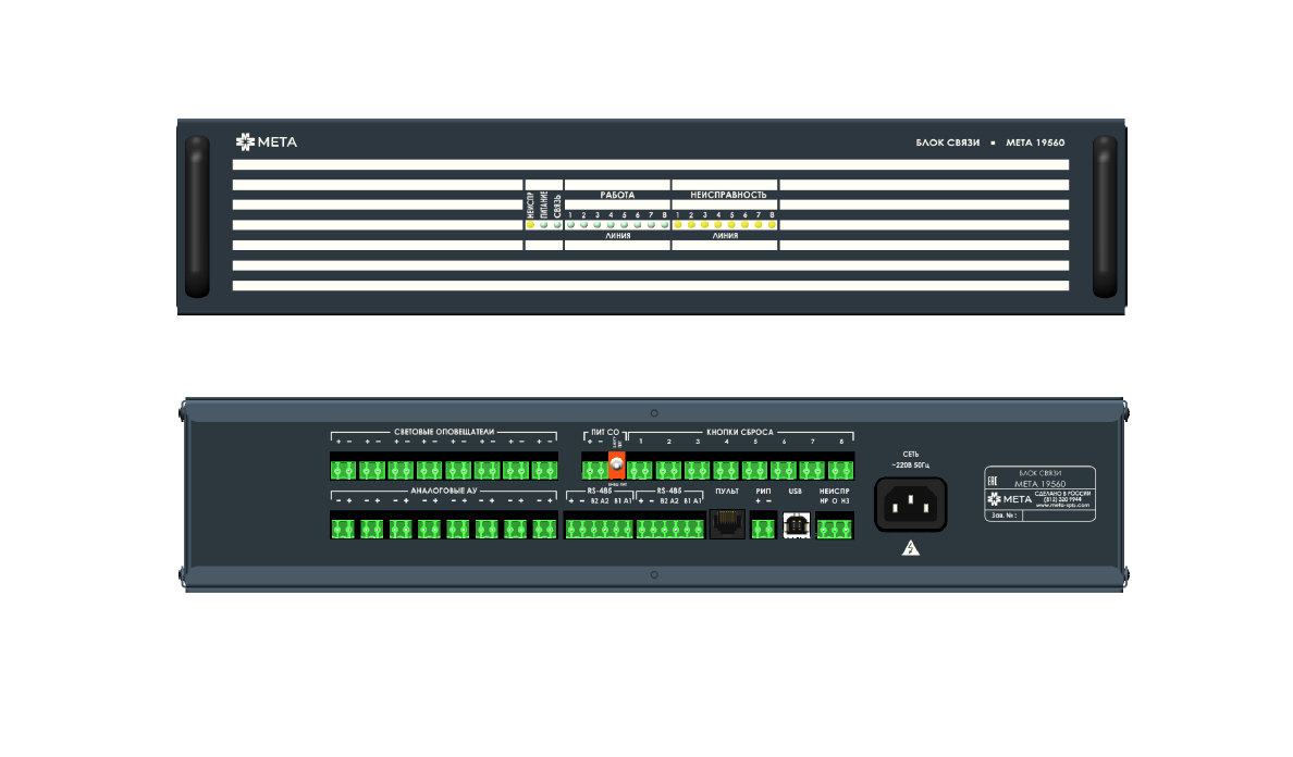 Блок связи МЕТА 19560 входит в состав прибора управления пожарного блочно-модульного для управления средствами речевого оповещения МЕТА 397 и предназначен для подключения абонентских устройств в общую сеть системы обратной связи.