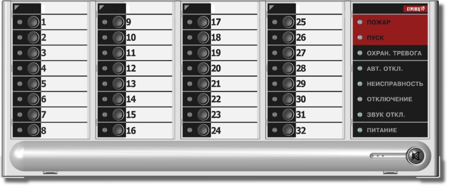 - 32 индикатора состояния ЗКПС / 32 кнопки управления / 8 статусных индикаторов