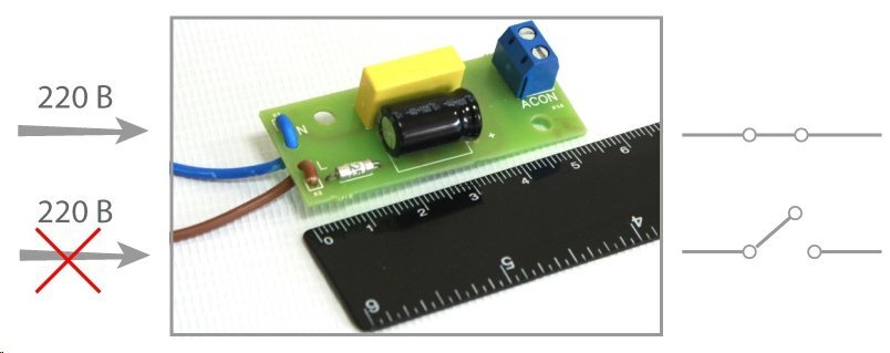 Датчик представляет собой устройство для выдачи информационного сообщения о наличии напряжения в электрической сети в формате “СУХИЕ КОНТАКТЫ РЕЛЕ” и реализован в виде модуля с гибкими проводниками и выходной колодкой.
