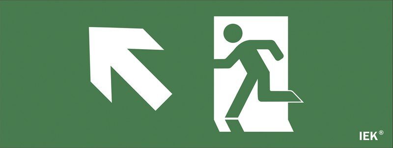 Самоклеящаяся этикетка "Фигура/стрелка вверх влево" для ДПА IP20/54, размер знака 240х90 мм, подходит для нанесения на аварийные светильники ДПА 2101, 2104, 2105, 5030, 5032, 5040, 5043, цвет зеленый