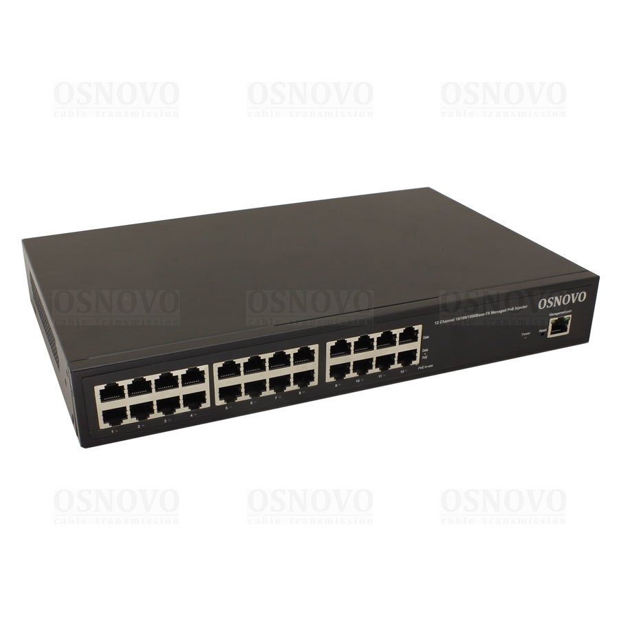 Управляемый PoE-инжектор Gigabit Ethernet на 12 портов. Соответствует стандартам PoE IEEE 802.3af/at. Автоматическое определение PoE устройств. Мощность PoE на порт - до 30Вт. Суммарная мощность PoE - до 180Вт. Вх. - 12 x RJ45 (10/100/1000 Base-T), вых. - 12 x RJ45(10/100/1000 Base-T, PoE, IEEE 802.3af/at), 1 x RJ45 Порт управления. Web интерфейс; 100-240AC В.; Встроенный БП; Монтаж в 19" стойку, крепление в комплекте; 440x44x200мм; -10...+45°C