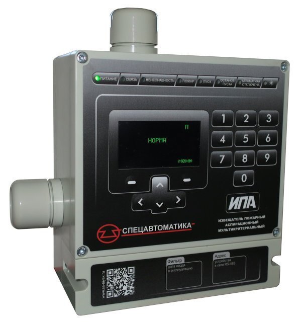 Извещатель пожарный аспирационный ИПА предназначен для защиты объектов от пожаров и управления автоматическими средствами пожаротушения. Принцип работы основан на активном отборе воздуха через систему труб с отверстиями, расположенную защищаемой зоне, анализа концентрации угарного газа, температуры, концентрации дыма и формирование извещений во внешние цепи сигналов «Дежурный режим», «Пожар 1», «Пожар 2», «Пуск», «Останов пуска», «Неисправность». ИПА относится к аспирационным извещателям с выбираемым классом чувствительности согласно п. 4.10.1.2 ГОСТ Р 53325-2012.