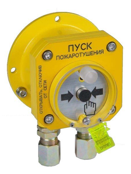 Устройство дистанционного пуска "ПУСК ПОЖАРОТУШЕНИЯ" жёлтого цвета взрывозащищенное 1Ex db IIC T6 Gb/Ex tb IIIC T85°C Db без самоконтроля с пломбированием стекла; 2-х или 4-х(НР) проводная схема подключения; с индикацией режимов работы; U-пит.9…28 В; I-потр.250 мкА; IP66/IP68; t-раб.-70…+85°С; 123x106x122 мм. Корпус из алюминиевого сплава. Без кабельных вводов.