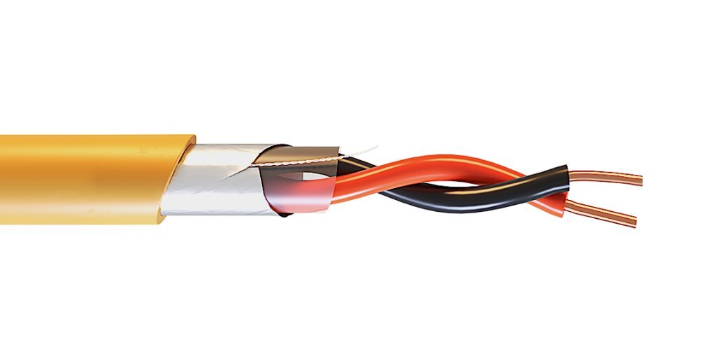 Кабель огнестойкий симметричный, групповой прокладки, в экране из алюмофлекса с дренажным проводником из медной луженой проволоки, в оболочке из не распространяющей горение, полимерной композиции не содержащей галогенов; две однопроволочных медных жилы сечением 1.0 кв.мм, в изоляции из огнестойкой силиконовой керамообразующей резины; t-раб.-50...+80°С; внешний диаметр 6.22 мм, масса 51.7 кг/км