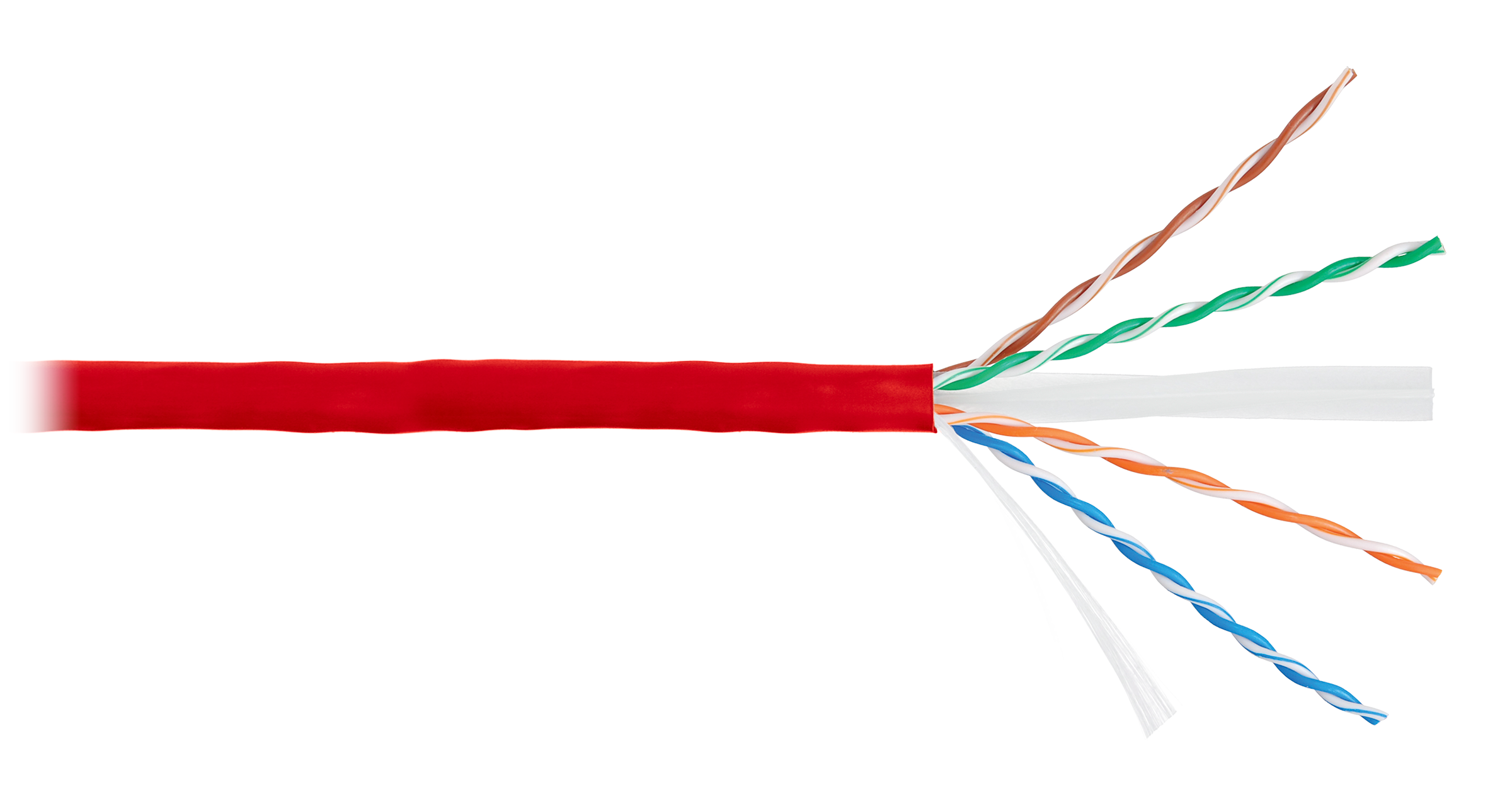 Кабель симметричный U/UTP неэкранированный, категория 6, 4х2х0.55, для внутренней прокладки, одножильный, LSZH нг(А)-HF, внешний диаметр 6.1 мм, t-раб.-20…+60°C, 305 м. Цвет красный.