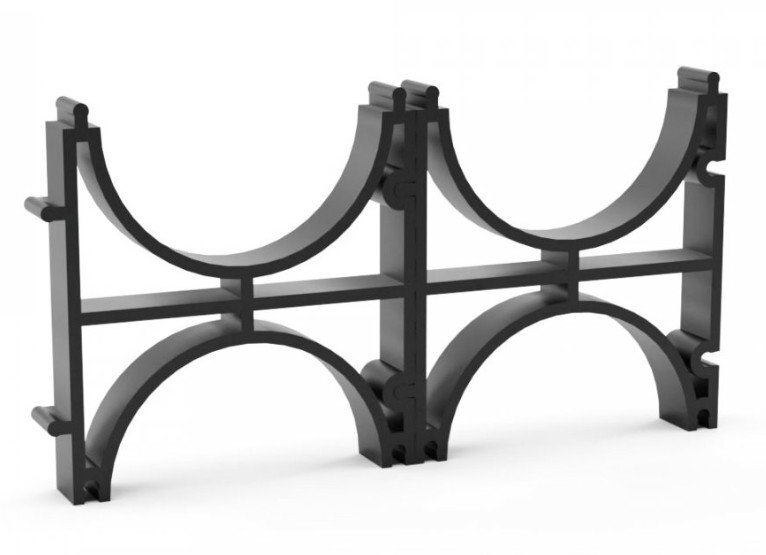 Предназначен для крепления и упорядочивания гибких, жёстких, дренажных и ливневых двустенных гофрированных труб одного диаметра при блочном монтаж.