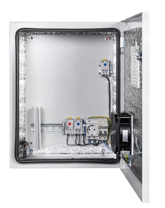 Шкаф климатический навесной с монтажной платой; 2 гермоввода (MG-25); внутренние размеры 377х477х190 мм (ШхВхГ); IP54, t-раб.-55…+50°С, 400х500х220 мм (ШхВхГ), 10.8 кг. Цвет серый. Комплектация: утеплитель из порилекса, замок 2 шт, ключ 1 шт, розетка 1 шт, автоматический выключатель, 6А 1 шт, клемма для подключения оборудования 2 шт, клемма заземления 1 шт, термореле 1 шт, реле предстарта 1 шт, вентиляционная решётка с фильтром 1 шт, вентилятор с решёткой и фильтром 1 шт, нагреватель мощностью 75 Вт 1 шт.