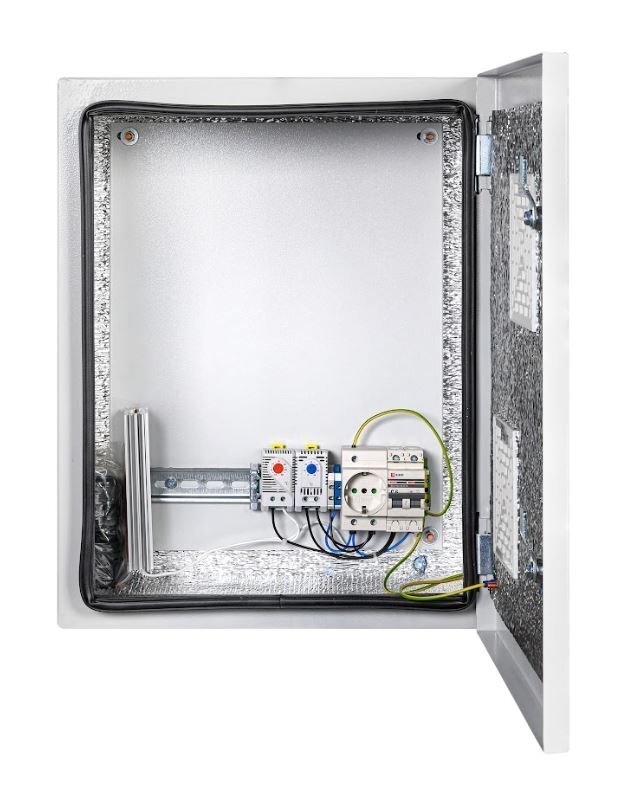 Шкаф климатический навесной с монтажной платой; 2 гермоввода (MG-25); внутренние размеры 377х477х220 мм (ШхВхГ); IP54, t-раб.-55…+50°С, 400х500х250 мм (ШхВхГ), 10.8 кг. Цвет серый. Комплектация: утеплитель из порилекса, замок 2 шт, ключ 1 шт, розетка 1 шт, автоматический выключатель, 6А 1 шт, клемма для подключения оборудования 2 шт, клемма заземления 1 шт, термореле 1 шт, реле предстарта 1 шт, вентиляционная решётка с фильтром 2 шт, нагреватель мощностью 100 Вт 1 шт.