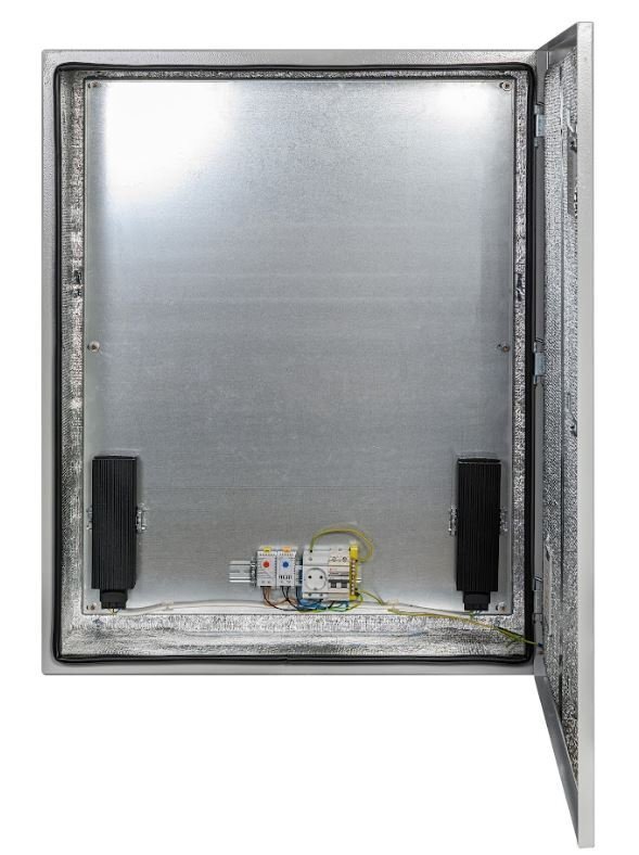 Шкаф климатический навесной с монтажной платой; 5 гермовводов (MG-25); внутренние размеры 777х977х270 мм (ШхВхГ); IP54, t-раб.-55…+50°С, 800х1000х300 мм (ШхВхГ), 45.8 кг. Цвет серый. Комплектация: утеплитель из порилекса, замок 2 шт, ключ 1 шт, розетка 1 шт, автоматический выключатель, 6А 1 шт, клемма для подключения оборудования 2 шт, клемма заземления 1 шт, термореле 1 шт, реле предстарта 1 шт, вентиляционная решётка с фильтром 2 шт, нагреватель мощностью 150 Вт 2 шт.
