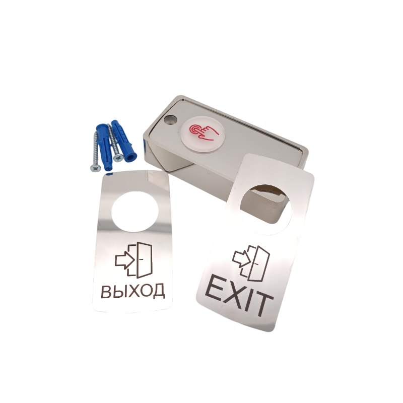 Сенсорная антивандальная накладная кнопка нормально разомкнутая (НР), с подсветкой нажимной части. IP54. В комплекте две лицевые накладки ВЫХОД - EXIT. Материал корпуса - алюминиевый сплав АД31 с многослойным гальваническим покрытием зеркальный хром. Материал лицевой части - полированная нержавеющая сталь 1мм, нажимная часть - акрил. Тип датчика емкостной. Коммутируемый напряжение/ток 36В и 100 мА. Индикация срабатывания световая, изменение цвета подсветки с белого на зеленый. DC 12…15 В, 10 мА (при 12 В), 80х40х19 мм.