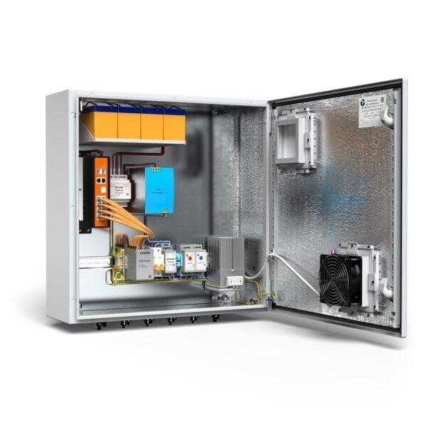 Всепогодный узел коммутации: гигабитный коммутатор, 8xRJ45 портов PоE 10/100/1000 Мбит/с(af/at/bt); 2 порта combo RJ45/SFP Uplink 1000 Мбит/с; PоE бюджет 300Вт; Watchdog; блок управления климатом БУК-5 и БУК-5В; обогреватель ОТШ-160, 230 В AC, 195 Вт; вентилятор ВТШ-70, 230 В AC, 22 Вт, фильтр ФТШ-70; БП 230/48-55В, 480Вт, устройством защиты электропитания УЗП-220; блоком защиты от импульсных перенапряжений БЗЛ-ЕП4х2; блок переключения питания с зарядным устройством БПЗУ-48, кронштейн для установки 4 АКБ до 9 Ач(АКБ приобретаются отдельно); оптический кросс с адаптерами SC-SC (4 шт.); тамперный контакт; автомат ВА47-292Р 6А; корпус из стали; гермовводы; AC 230В± 10%; 590Вт; IP66; -50…+50°С; 600х600х210 мм.