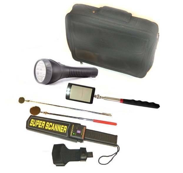 Комплект КОНДОР - фонарь, металлоискатель, 3 досмотровых зеркала. Металлодетектор: -15...+50°C, питание-батарея 9 В "Крона", дальность обнаружения металлических объектов: игла швейная - 4 см, монета 1 руб - 6 см, пистолет ПМ - 25 см, 50 часов непрерывной работы, 410х80х30 мм, 300 гр. Досмотровое зеркало: 8х5,5 см, выдвижная штанга 17...80 см, регулируемый угол крепление зеркала, питание 2xCR2032. Досмотровое круглое сферическое зеркало D 5 см, выдвижная штанга 17...40 см, регулируемый угол крепление зеркала, питание 2xCR2032. Досмотровое круглое сферическое зеркало D 3 см, выдвижная штанга 10...40 см, регулируемый угол крепление зеркала. Светодиодный фонарь с аккумулятором и встроенным зарядным устройством от сети 220 В.