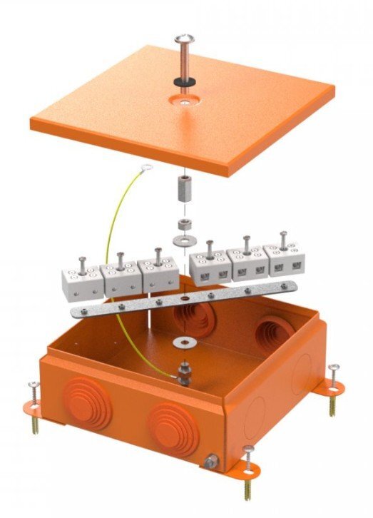 Металлическая коробка для огнестойких кабельных линий отличается высокой степенью защиты от вредных внешних воздействий, таких как ударные нагрузки и проникновение влаги и пыли (IP55 с использованием обычных гермовводов, либо IP68 при использовании специальных сальников или соединительных муфт (в комплект не входят) с аналогичной степенью защиты), а так же обеспечивает заземление электрической системы. Металлический корпус обеспечивает защиту от ударных нагрузок, более высокую морозоустойчивость, предотвращает распространение пламени и не выделяет галогены. Максимальный диаметр ввода труб при помощи вводных муфт (кабельных вводов) 32 мм. Удобный монтаж обеспечивается вынесенными элементами для крепления. Возможен прямой монтаж при пристреливании рядом с существующим отверстием.
