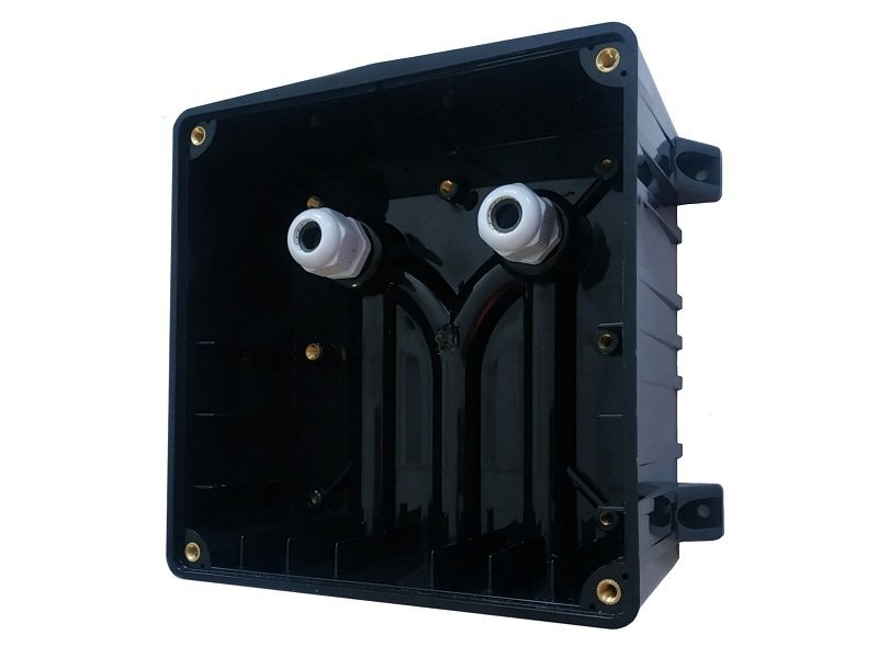Монтажная коробка усиленная накладная с внешним креплением через 4 "проушины" и штатным отверстием D 30 мм в крышке, с 2-мя гермовводом ПКВ20х1,5 и двумя отверстиями с тыльной стороны для подключении кабеля D 6-14 мм, предназначена для наружной установки крупногабаритных камер видеонаблюдения, с возможностью установки платы питания и АКБ 12В 7А·ч; пластиковый корпус; масса 0.75кг; цвет черный, -70...+70°C; IP 66/67; 180х180х97мм