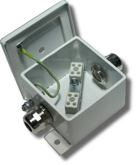 Корпус коробки целиком изготовлен из стали 2,5-3 мм. Имеет двойную защиту от коррозии ( гальваническое покрытие и покраска). Крышка прижимается к корпусу через силиконовую прокладку. Винт крепления крышки снабжен уплотняющей тарельчатой шайбой с фторопластовым покрытием. Внутри корпуса коробки установлены керамические клеммные колодки, обеспечивающие соединение "под винт", и клемма заземления. В боковых стенках устанавливаются металлические кабельные вводы. Крепление коробки к элементам конструкций рекомендуется осуществлять на приварные пластины с применением гаек и винтов или с помощью саморезов и металлических дюбелей.