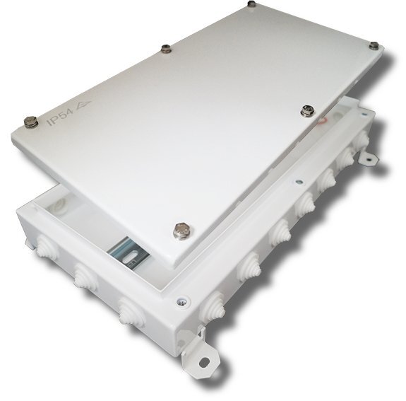 Корпус коробки имеет двойную защиту от коррозии (гальваническое покрытие и покраска). Крышка прижимается к корпусу через силиконовую прокладку. Винт крепления крышки снабжен уплотняющей тарельчатой шайбой с фторопластовым покрытием. Внутри корпуса коробки установлены керамические клеммные колодки, обеспечивающие соединение "под винт", и клемма заземления «РЕ». В боковых стенках устанавливаются втулки уплотнительные IP54 мембранного типа. Крепление коробки к элементам конструкций рекомендуется осуществлять с применением винтов или саморезов на металлические дюбели.