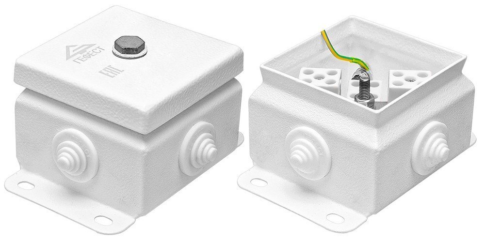 Внутри корпуса монтажной коробки установлены керамические клеммные колодки, обеспечивающие соединение «под винт», и зажим заземления. Крышка монтажной коробки соединяется проводом заземления с зажимом «РЕ» внутри корпуса.