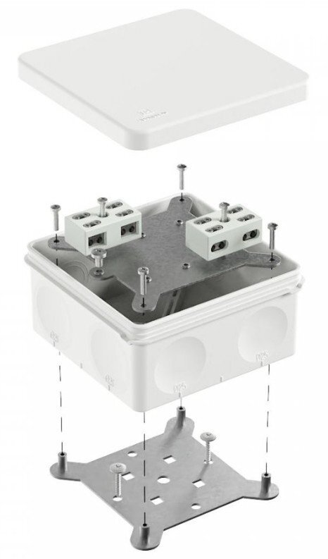 Коробка огнестойкая разветвительная Е15-Е60 для открытой проводки двухкомпонентная, безгалогенная; 8 каб.вводов с мембранами, керам. клеммник на 4 полюса 6.0 мм?, парные клеммы для разветвления, УХЛ1, IP66, t-раб. -45…+60°C, габ.размеры 100х100х50 мм, белая.