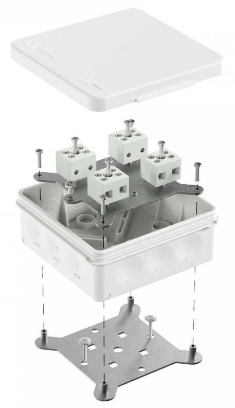Коробка огнестойкая Е15-Е120 для открытой проводки двухкомпонентная, безгалогенная, стойкая к УФ; 12 каб.вводов с мембранами, керам. клеммник на 8 полюсов 6.0 мм?, УХЛ1, IP66, t-раб. -45…+60°C, габ.размеры 100х100х40 мм, белая.