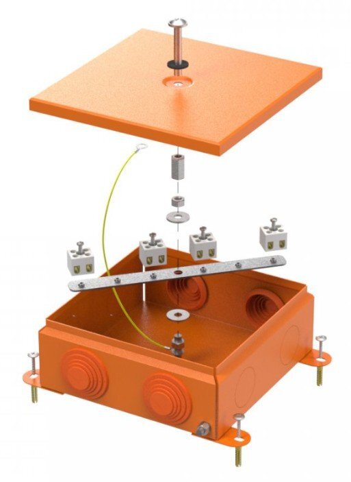 Металлическая коробка для огнестойких кабельных линий отличается высокой степенью защиты от вредных внешних воздействий, таких как ударные нагрузки и проникновение влаги и пыли (IP55 с использованием обычных гермовводов, либо IP68 при использовании специальных сальников или соединительных муфт (в комплект не входят) с аналогичной степенью защиты), а так же обеспечивает заземление электрической системы. Металлический корпус обеспечивает защиту от ударных нагрузок, более высокую морозоустойчивость, предотвращает распространение пламени и не выделяет галогены. Максимальный диаметр ввода труб при помощи вводных муфт (кабельных вводов) 32 мм. Удобный монтаж обеспечивается вынесенными элементами для крепления. Возможен прямой монтаж при пристреливании рядом с существующим отверстием.