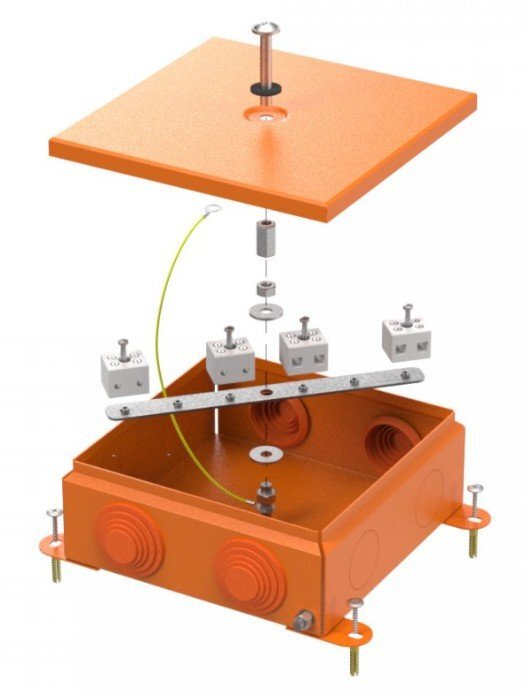 Металлическая коробка для огнестойких кабельных линий отличается высокой степенью защиты от вредных внешних воздействий, таких как ударные нагрузки и проникновение влаги и пыли (IP55 с использованием обычных гермовводов, либо IP68 при использовании специальных сальников или соединительных муфт (в комплект не входят) с аналогичной степенью защиты), а так же обеспечивает заземление электрической системы. Металлический корпус обеспечивает защиту от ударных нагрузок, более высокую морозоустойчивость, предотвращает распространение пламени и не выделяет галогены. Максимальный диаметр ввода труб при помощи вводных муфт (кабельных вводов) 32 мм. Удобный монтаж обеспечивается вынесенными элементами для крепления. Возможен прямой монтаж при пристреливании рядом с существующим отверстием.