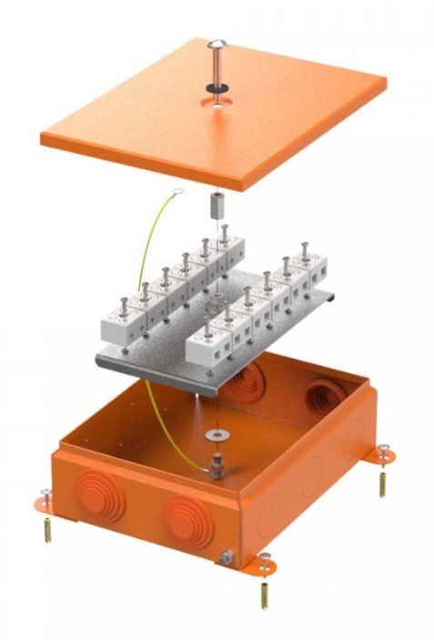 Металлическая коробка для огнестойких кабельных линий отличается высокой степенью защиты от вредных внешних воздействий, таких как ударные нагрузки и проникновение влаги и пыли (IP55 с использованием обычных гермовводов, либо IP68 при использовании специальных сальников или соединительных муфт (в комплект не входят) с аналогичной степенью защиты), а так же обеспечивает заземление электрической системы. Металлический корпус обеспечивает защиту от ударных нагрузок, более высокую морозоустойчивость, предотвращает распространение пламени и не выделяет галогены. Максимальный диаметр ввода труб при помощи вводных муфт (кабельных вводов) 32 мм. Удобный монтаж обеспечивается вынесенными элементами для крепления. Возможен прямой монтаж при пристреливании рядом с существующим отверстием.