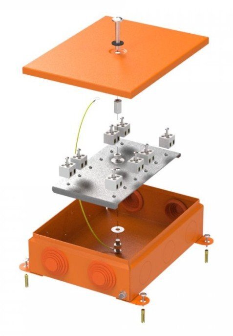 Коробка металлическая огнестойкая, стойкая к УФ; огнестойкость Е15-Е120; 4 ступенчатых каб.вводов под трубу D32 мм, керам.клеммник на 16 полюсов, сечение кабеля до 2.5 мм?; IP55, t-раб.-60…+50°C; габ.размеры 150х200х60 мм Цвет оранжевый (RAL 2004).