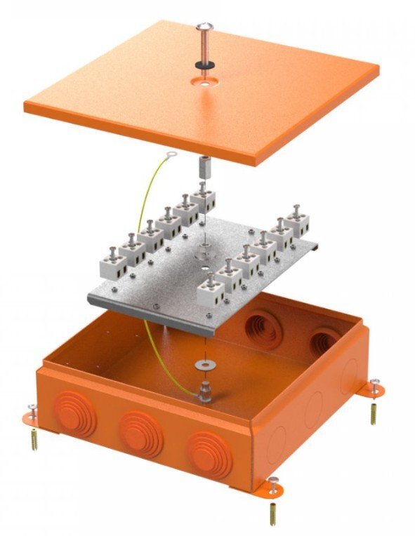 Металлическая коробка для огнестойких кабельных линий отличается высокой степенью защиты от вредных внешних воздействий, таких как ударные нагрузки и проникновение влаги и пыли (IP55 с использованием обычных гермовводов, либо IP68 при использовании специальных сальников или соединительных муфт (в комплект не входят) с аналогичной степенью защиты), а так же обеспечивает заземление электрической системы. Металлический корпус обеспечивает защиту от ударных нагрузок, более высокую морозоустойчивость, предотвращает распространение пламени и не выделяет галогены. Максимальный диаметр ввода труб при помощи вводных муфт (кабельных вводов) 32 мм. Удобный монтаж обеспечивается вынесенными элементами для крепления. Возможен прямой монтаж при пристреливании рядом с существующим отверстием.