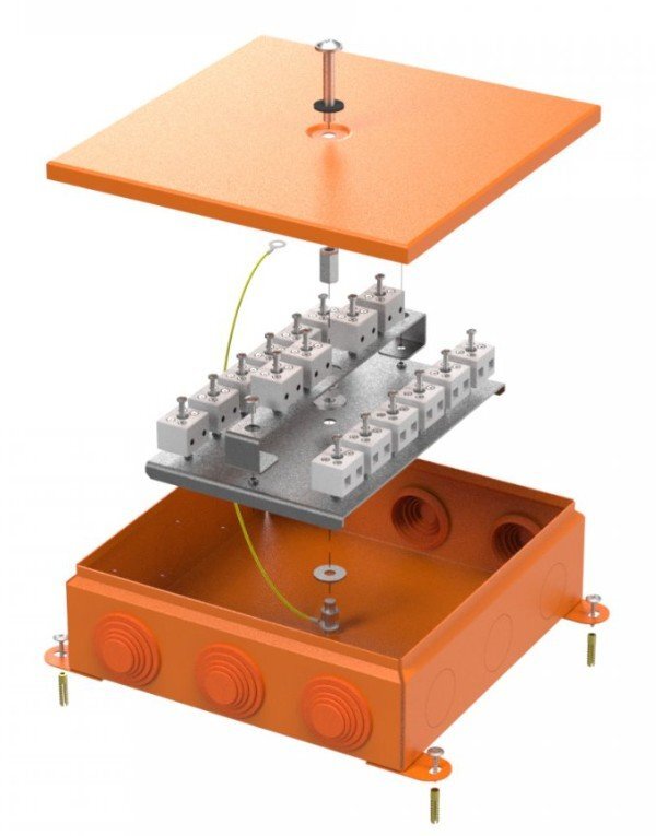 Металлическая коробка для огнестойких кабельных линий отличается высокой степенью защиты от вредных внешних воздействий, таких как ударные нагрузки и проникновение влаги и пыли (IP55 с использованием обычных гермовводов, либо IP68 при использовании специальных сальников или соединительных муфт (в комплект не входят) с аналогичной степенью защиты), а так же обеспечивает заземление электрической системы. Металлический корпус обеспечивает защиту от ударных нагрузок, более высокую морозоустойчивость, предотвращает распространение пламени и не выделяет галогены. Максимальный диаметр ввода труб при помощи вводных муфт (кабельных вводов) 32 мм. Удобный монтаж обеспечивается вынесенными элементами для крепления. Возможен прямой монтаж при пристреливании рядом с существующим отверстием.