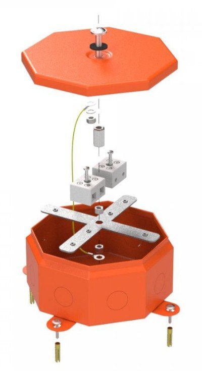 Металлическая коробка Октагон для огнестойких кабельных линий отличается формой изделия - коробка имеет 8 сторон, на каждой из которых имеется выламываемое отверстие. Это позволяет ввести большее количество кабеленесущих изделий или кабельно-проводниковой продукции через гермоввод (входят в комплект в количестве 8 штук), который обеспечивает высокую степень защиты IP55. Использование специальных сальников или соединительных муфт (в комплект не входят) обеспечит степень защиты IP68 от вредных внешних воздействий, таких как ударные нагрузки и проникновение влаги и пыли. Корпус коробки изготовлен из листовой стали с последующим окрашиванием всех поверхностей. Максимальный диаметр ввода труб при помощи вводных муфт (кабельных вводов) 25 мм. Возможен прямой монтаж при пристреливании рядом с существующим отверстием для крепления.