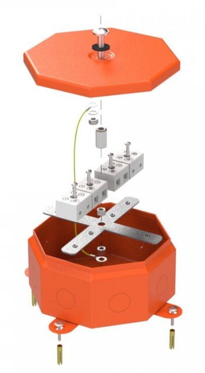Металлическая коробка Октагон для огнестойких кабельных линий отличается формой изделия - коробка имеет 8 сторон, на каждой из которых имеется выламываемое отверстие. Это позволяет ввести большее количество кабеленесущих изделий или кабельно-проводниковой продукции через гермоввод (входят в комплект в количестве 8 штук), который обеспечивает высокую степень защиты IP55. Использование специальных сальников или соединительных муфт (в комплект не входят) обеспечит степень защиты IP68 от вредных внешних воздействий, таких как ударные нагрузки и проникновение влаги и пыли. Корпус коробки изготовлен из листовой стали с последующим окрашиванием всех поверхностей. Максимальный диаметр ввода труб при помощи вводных муфт (кабельных вводов) 25 мм. Возможен прямой монтаж при пристреливании рядом с существующим отверстием для крепления.