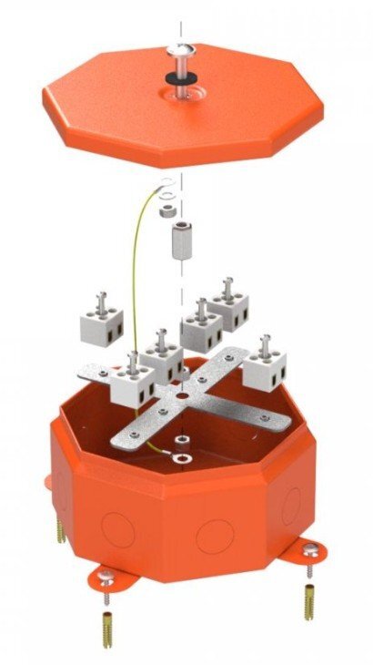 Металлическая коробка Октагон для огнестойких кабельных линий отличается формой изделия - коробка имеет 8 сторон, на каждой из которых имеется выламываемое отверстие. Это позволяет ввести большее количество кабеленесущих изделий или кабельно-проводниковой продукции через гермоввод (входят в комплект в количестве 8 штук), который обеспечивает высокую степень защиты IP55. Использование специальных сальников или соединительных муфт (в комплект не входят) обеспечит степень защиты IP68 от вредных внешних воздействий, таких как ударные нагрузки и проникновение влаги и пыли. Корпус коробки изготовлен из листовой стали с последующим окрашиванием всех поверхностей. Максимальный диаметр ввода труб при помощи вводных муфт (кабельных вводов) 25 мм. Возможен прямой монтаж при пристреливании рядом с существующим отверстием для крепления.