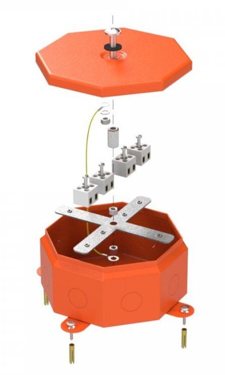 Металлическая коробка Октагон для огнестойких кабельных линий отличается формой изделия - коробка имеет 8 сторон, на каждой из которых имеется выламываемое отверстие. Это позволяет ввести большее количество кабеленесущих изделий или кабельно-проводниковой продукции через гермоввод (входят в комплект в количестве 8 штук), который обеспечивает высокую степень защиты IP55. Использование специальных сальников или соединительных муфт (в комплект не входят) обеспечит степень защиты IP68 от вредных внешних воздействий, таких как ударные нагрузки и проникновение влаги и пыли. Корпус коробки изготовлен из листовой стали с последующим окрашиванием всех поверхностей. Максимальный диаметр ввода труб при помощи вводных муфт (кабельных вводов) 25 мм. Возможен прямой монтаж при пристреливании рядом с существующим отверстием для крепления.