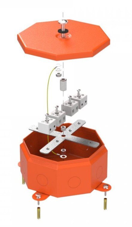 Металлическая коробка Октагон для огнестойких кабельных линий отличается формой изделия - коробка имеет 8 сторон, на каждой из которых имеется выламываемое отверстие. Это позволяет ввести большее количество кабеленесущих изделий или кабельно-проводниковой продукции через гермоввод (входят в комплект в количестве 8 штук), который обеспечивает высокую степень защиты IP55. Использование специальных сальников или соединительных муфт (в комплект не входят) обеспечит степень защиты IP68 от вредных внешних воздействий, таких как ударные нагрузки и проникновение влаги и пыли. Корпус коробки изготовлен из листовой стали с последующим окрашиванием всех поверхностей. Максимальный диаметр ввода труб при помощи вводных муфт (кабельных вводов) 25 мм. Возможен прямой монтаж при пристреливании рядом с существующим отверстием для крепления.