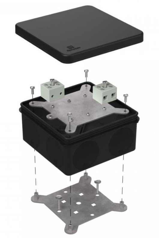 Коробка огнестойкая двухкомпонентная безгалогеновая (HF), стойкая к УФ; огнестойкость Е15-Е120; 8 мембранных каб.вводов под трубу D25 мм, керам.клеммник на 4 полюса 6.0 мм?; IP66, t-раб.-45…+60°C; габ.размеры 100х100х50 мм, цвет черный (RAL 9005). Подходит для прямого монтажа (пистолетом)