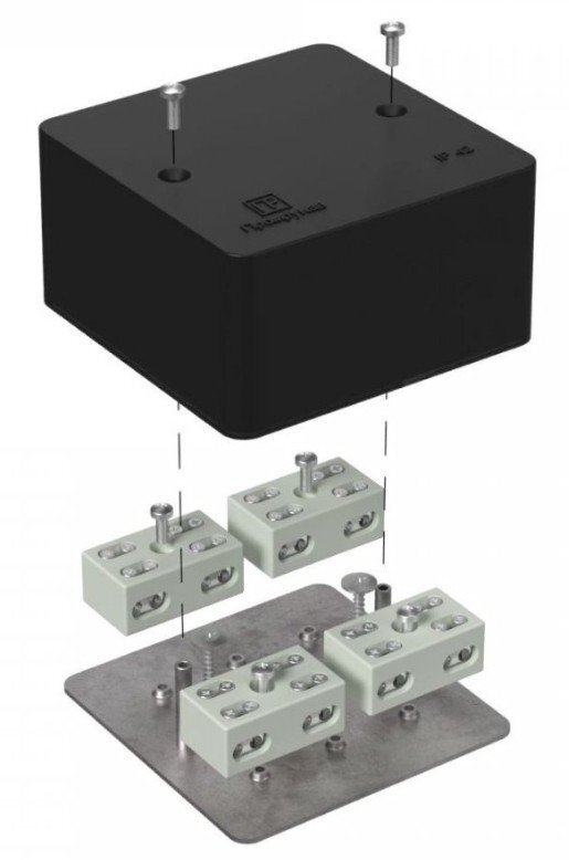 Коробка огнестойкая разветвительная для кабель-канала; Е15-Е60; керам.клеммник на 8 полюсов, сечение кабеля до 6.0 мм?, парные клеммы для разветвления, безгалогенная (HF); УХЛ4, IP42, t-раб.-25…+40°C, габ.размеры 85х85х45 мм. Цвет черный (RAL 9005).