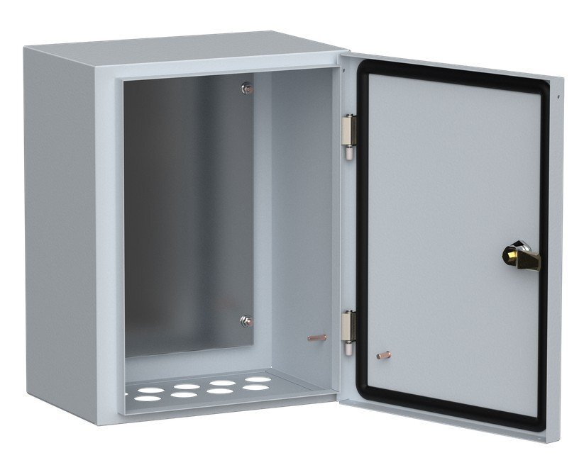 Сварной металлический корпус со съемной монтажной панелью. Дверца корпуса запирается на замок. Ключ замка имеет единый секрет.